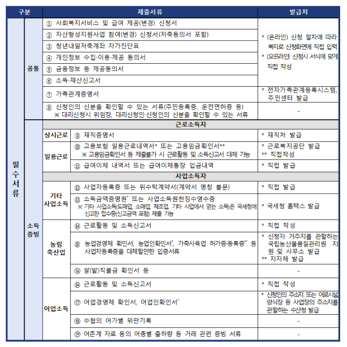 - 공통: 신청서, 소득·재산 신고서, 신분증, 청년내일저축계좌 자가진단표 등