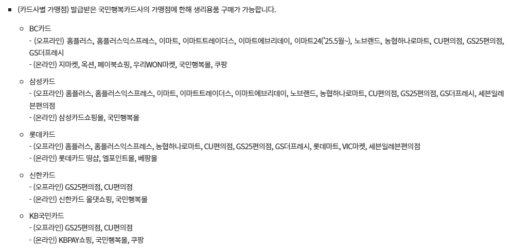 - 사용방법 : 국민행복카드(BC, 삼성, 롯데, 신한, 국민)를 발급받은 후 가맹점에서 생리용품 구매